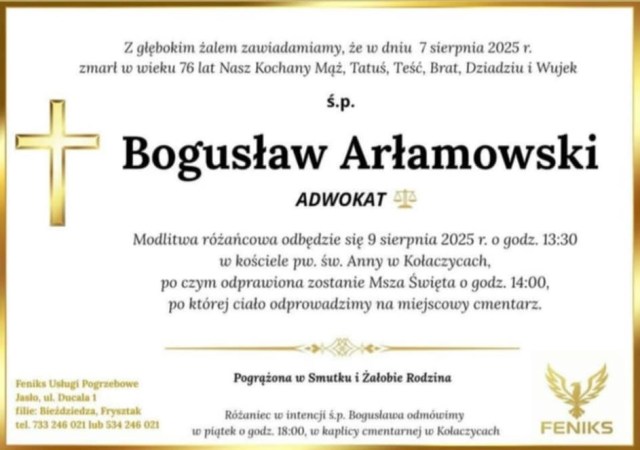 W dniu wczorajszym 07.08.25, po przebytym ciężkim zawale serca zmarł mecenas Bogusław Arłamowski, znany dębicki adwokat. Bochnianin z urodzenia.