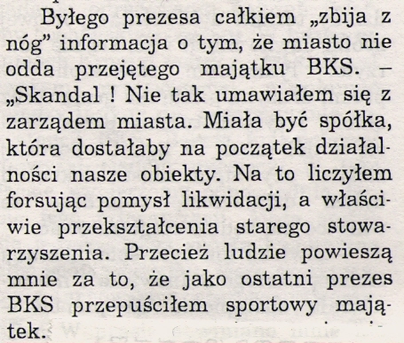 Niestety, obietnice świetlanej przyszłości dla BKS-u okazały się fikcją, ze spółki wyszły przysłowiowe „nici”, ale obiektów Miasto już Klubowi nie zwróciło. W tym miejscu należy przypomnieć, że w momencie przekazywania majątku, Klub był zadłużony w stosunku do trenerów i Zakładu Energetycznego na „zawrotną” sumę w wysokości siedem tysięcy złotych (sic!!!). Dlatego też mówienie o bankructwie Klubu i wydatkach Miasta na jego utrzymanie, biorąc pod uwagę wartość przejętego majątku, jest nadużyciem i wręcz zwykłym oszustwem dokonanym przez magistrackich urzędników.