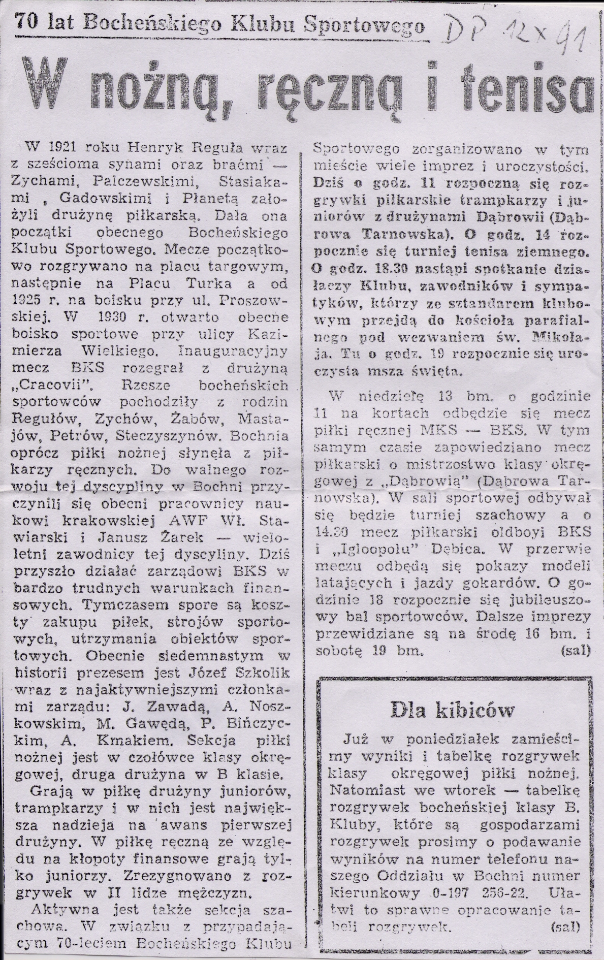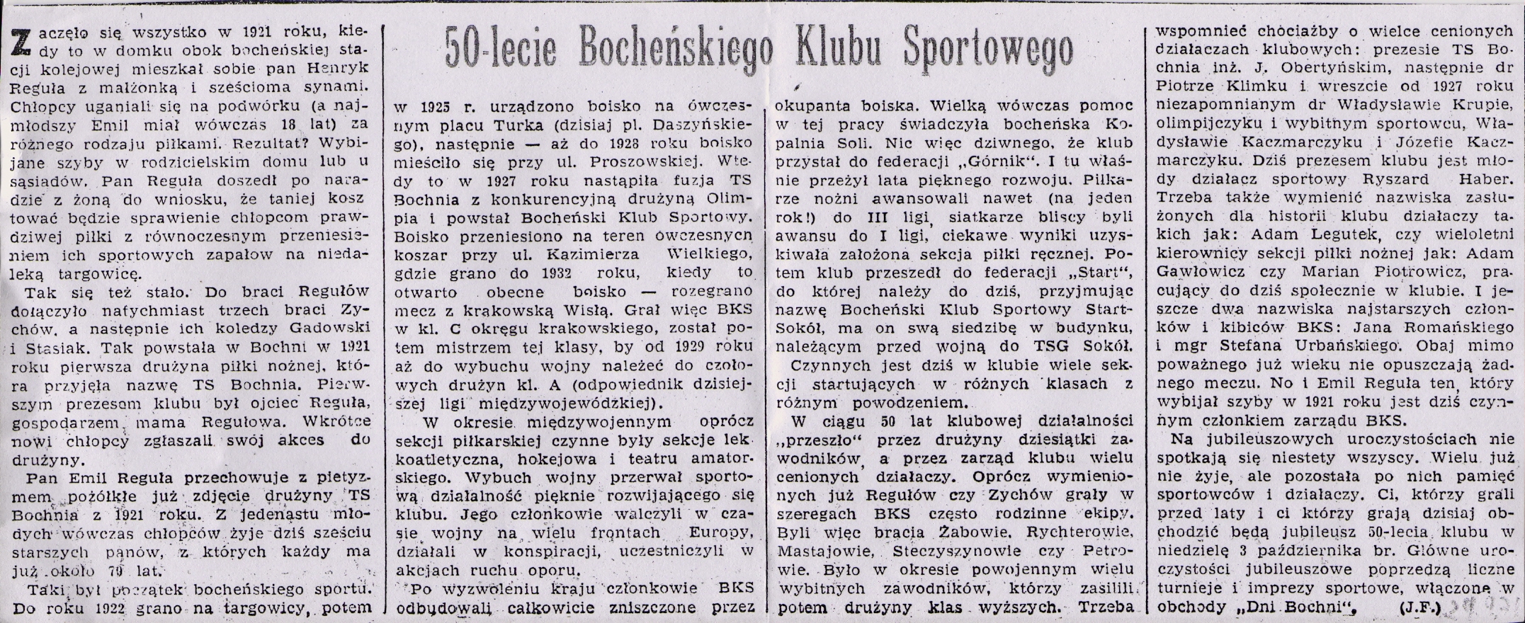 Mam nadzieję, że w związku z jubileuszem Klubu odbędzie się Nadzwyczajne Walne Zebranie Członków Bocheńskiego Klubu Sportowego, które jako najwyższa klubowa władza podejmie zdecydowane starania związane z odzyskaniem klubowych obiektów przejętych przez Miasto w do dziś niewyjaśnionych okolicznościach. (JZ)