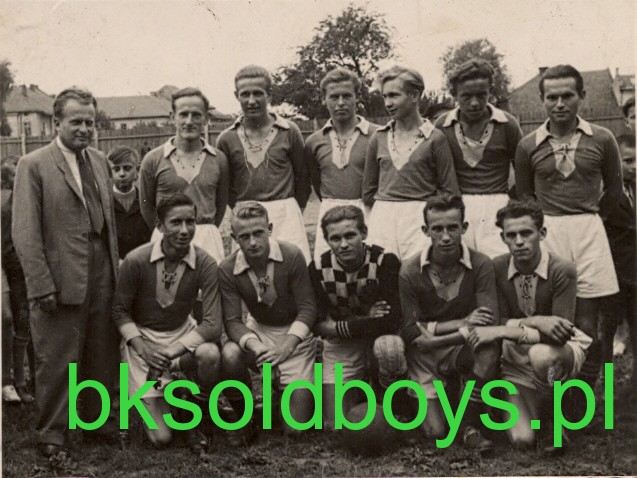 Stoją od lewej: trener Adamczyk Stanisław, Kinczel Władysław, Piesiur Eryk, Samoder Kazimierz, Wilk Wilhelm, Turkiewicz Roman, NN, poniżej: Krakowski Józef, Lupa Eugeniusz, bramkarz Kulik, Krakowski? Kazimierz, Kurpiel Władysław.