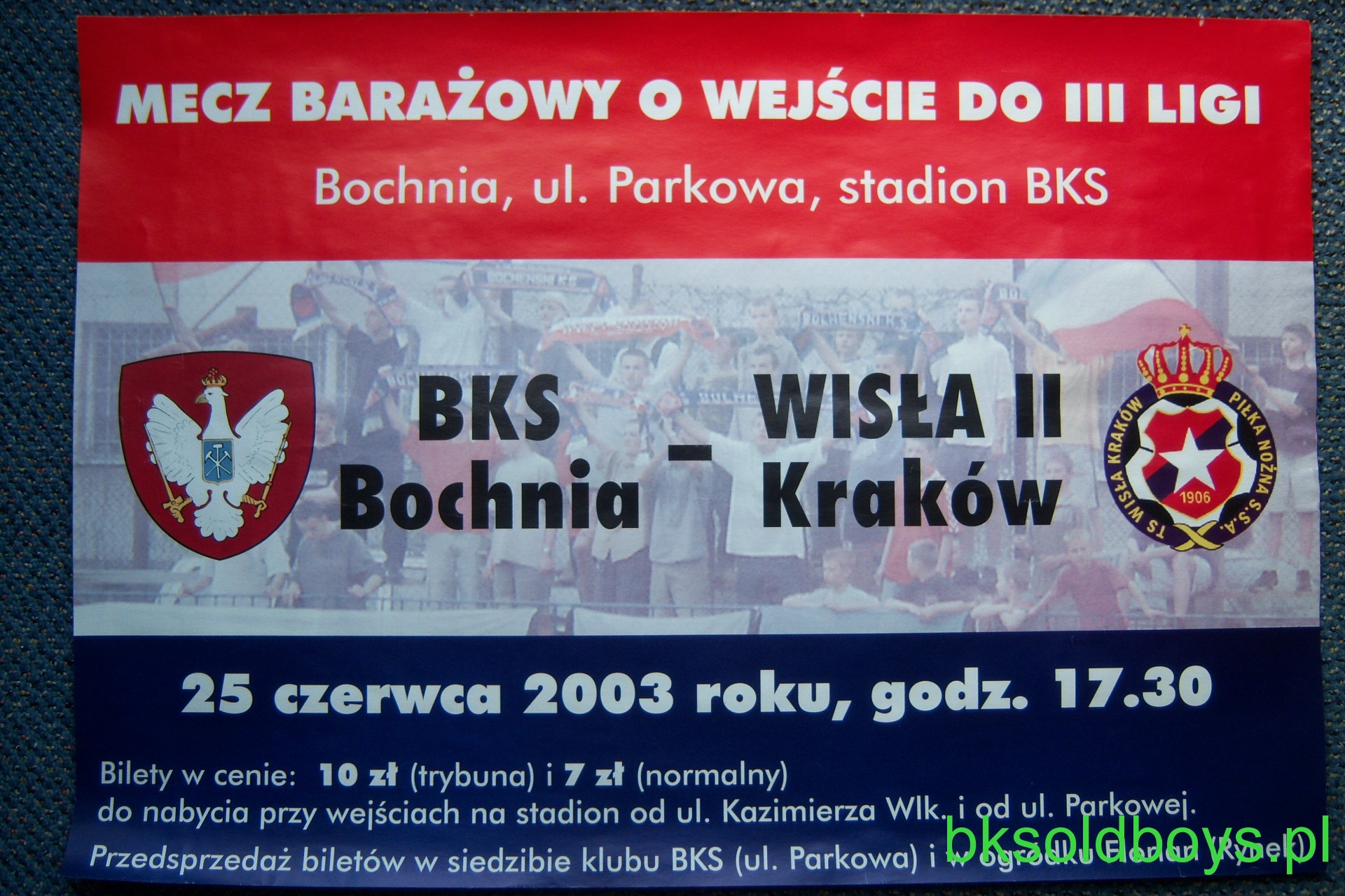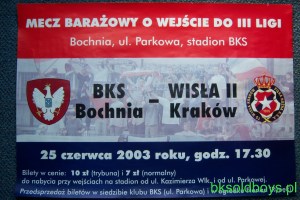 Ponad pół wieku upłynęło, by po raz wtóry zespół piłkarski Bocheńskiego Klubu Sportowego uzyskał trzecioligowy awans w tej dyscyplinie sportu. Przez całe dziesięciolecia, całkiem spore rzesze bocheńskich kibiców bezskutecznie wypatrywały upragnionej trzeciej ligi. Czasami było już tak blisko… …gdyby nie ta „Wisełka”… (pamiątkowy plakat z tamtego meczu…)