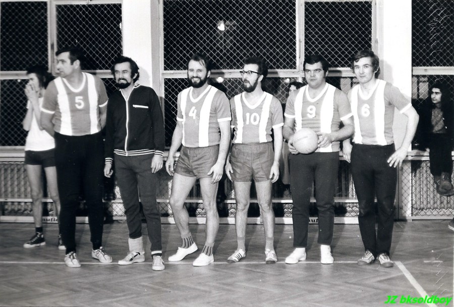 Reprezentacja bocheńskich nauczycieli w piłce siatkowej – od lewej: Józef Lysy, Janusz Kurkiewicz, Jerzy Widło, Jerzy Inwałd, Zbigniew Maliszczak, Jacek Tyrka