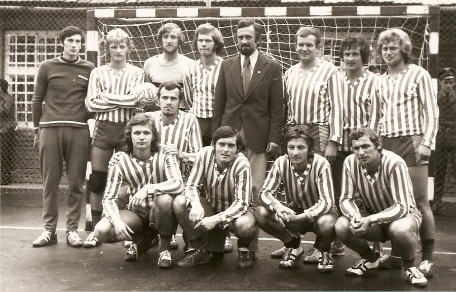 Lata 70-te… od lewej: J.Adamski, W. Całka, R. Machaj, J. Kuźniar, trener J. Kurkiewicz, J. Furmański, (?), (?)Osinka, poniżej:A. Przeklasa, A. Broszkiewicz, K. Bacik, W. Wnęk, St. Żabczyński.