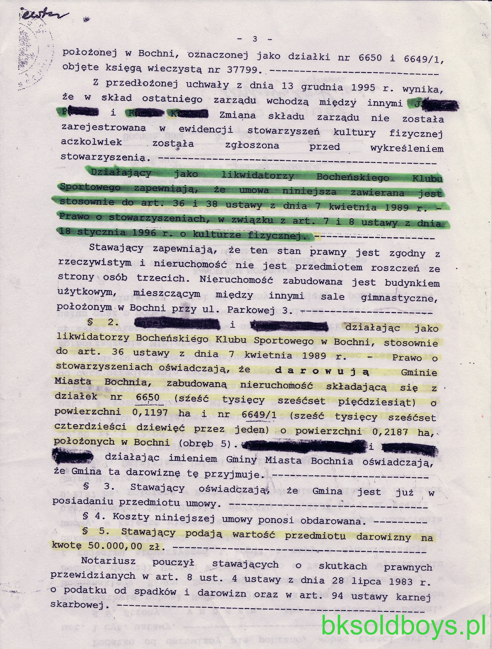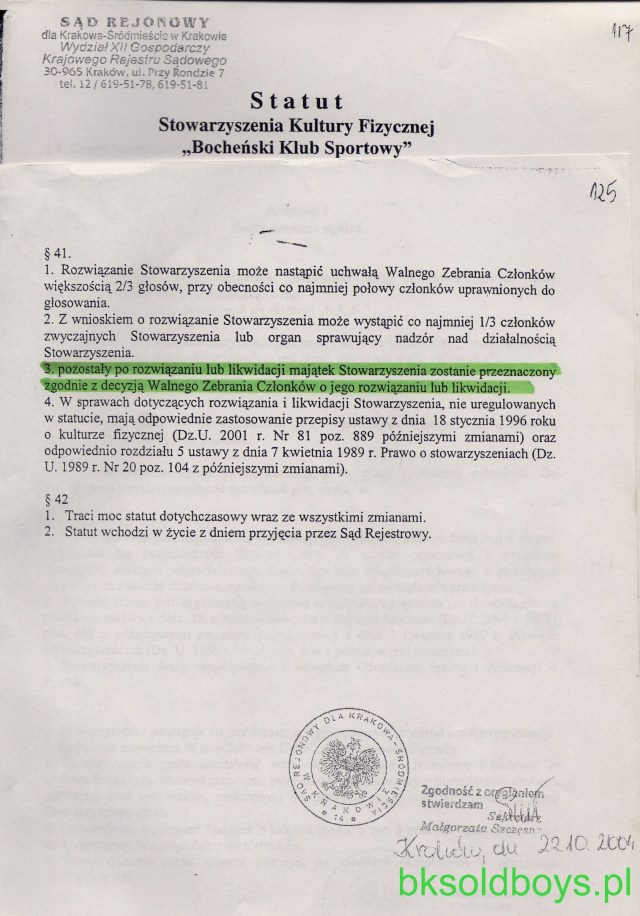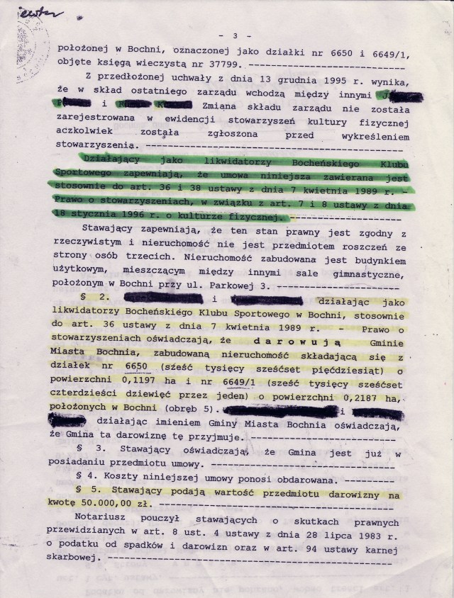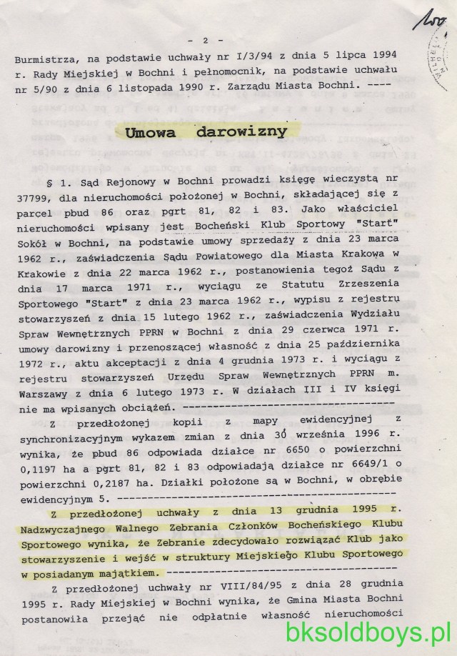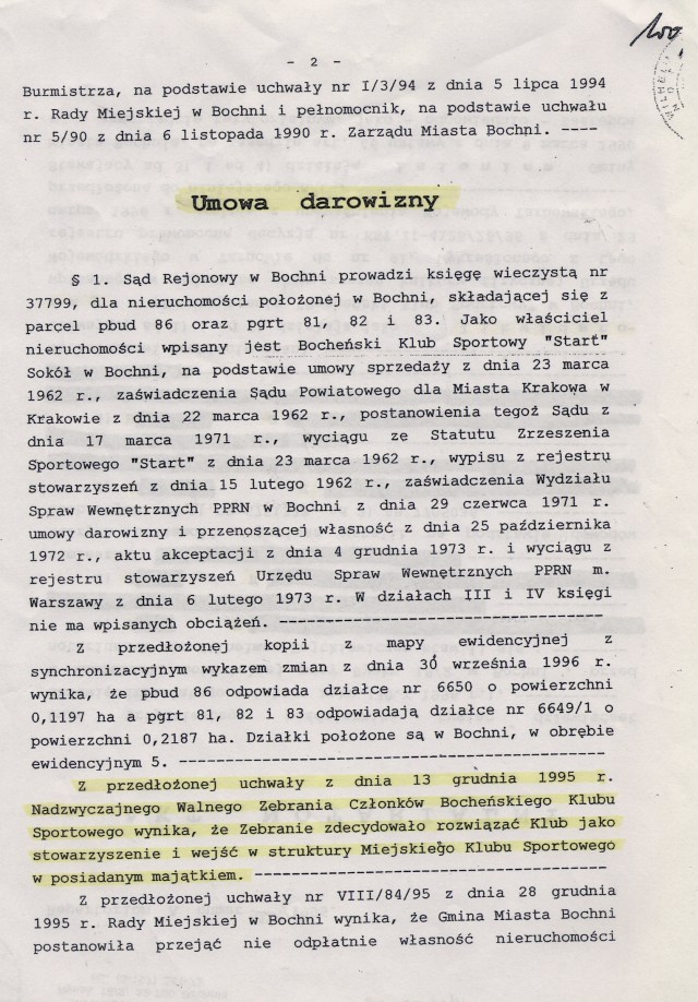 Pismo z Urzędu Miasta z podpisami obecnego burmistrza Bochni i jego zastępczyni, informuje o tym, że Miasto nie posiada w/w dokumentu. Nie mam podstaw, by nie wierzyć p.burmistrzowi, ale tym właśnie dokumentem posługiwała się pani wiceburmistrz na ostatnim walnym zebraniu BKS-u ( nagranie TV Moja Bochnia oraz dyktafony), cytując wyrwane z kontekstu zdania w obecności kilkudziesięciu osób na sali. Wg. mojej wiedzy, dokument ów, będący własnością Bocheńskiego Klubu Sportowego został „uwięziony” w sejfie MOSiR-u przy ul. Parkowej w czasach, gdy jeszcze w budynku klubowym równolegle funkcjonowały obydwa podmioty, zarówno MOSiR, jak i BKS. . W jaki sposób się tam znalazł – pozostaje „słodką tajemnicą” pewnych osób. Najzwyklejsza konfrontacja odpisu uchwały z oryginałem pozwoli rozwiać wszystkie wątpliwości – czy „wejście z posiadanym majątkiem” oznacza to samo co „darowizna”.