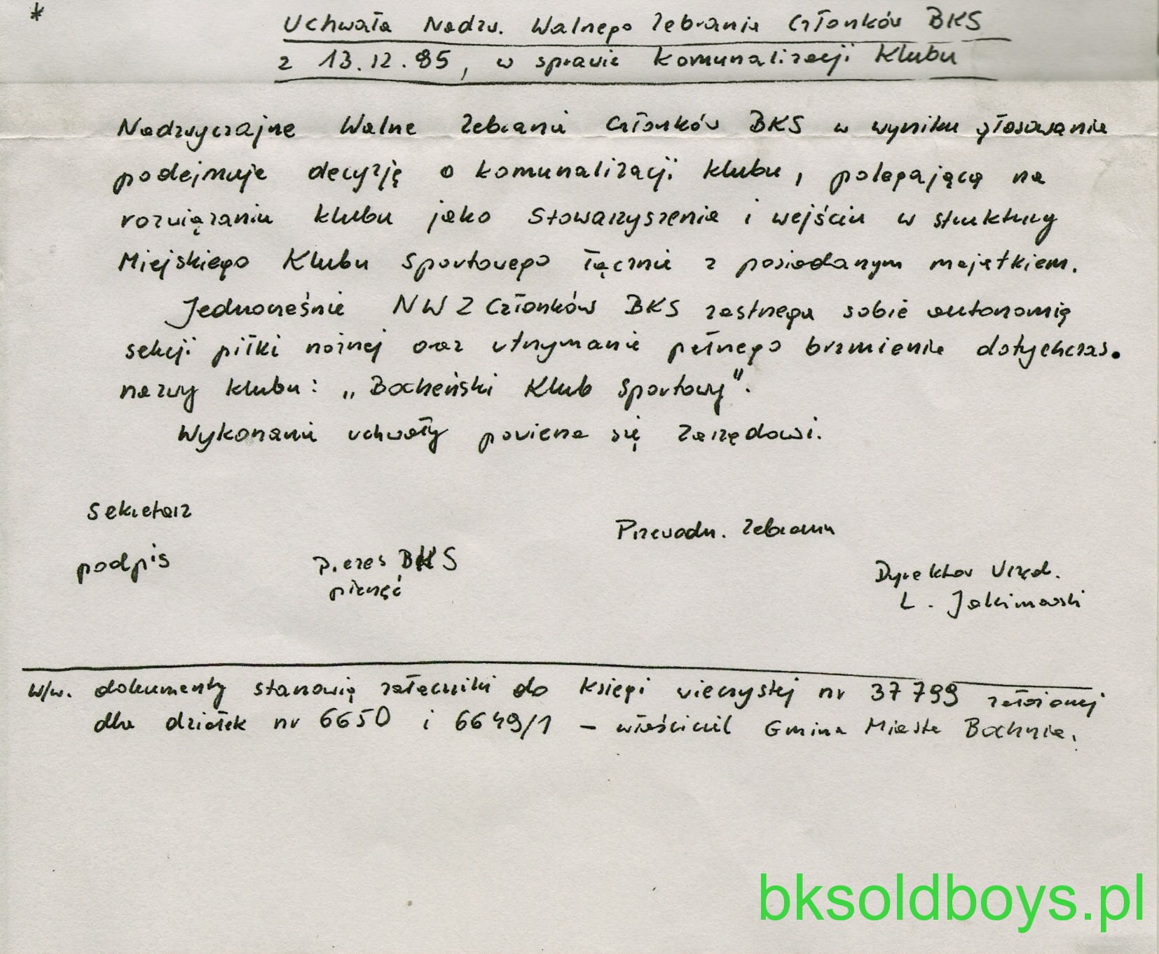 Mianowani likwidatorzy tymczasem d a r o w a l i Miastu klubowy majątek. Kto ich do tego upoważnił? – prawomocna i jedynie obowiązująca w/w Uchwała Walnego Zebrania ani słowem nie wspomina o jakiejkolwiek darowiźnie! Wręcz przeciwnie – ZOBOWIĄZUJE Zarząd Klubu do wykonania ustaleń podjętych na tym zebraniu!!! Odręczny (skrócony) odpis dokumentu znajdującego się w Sądzie Rejonowym w Bochni, dokonany przez radnego miejskiego J.B.: