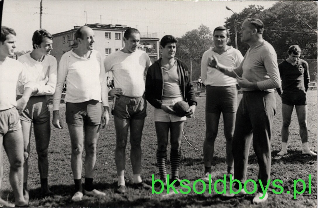 Przed sparingiem z młodzieżą, starsi panowie w skupieniu wysłuchują wskazówek trenerskich od legendy bocheńskiego sportu p.Aleksandra Urbana, najstarszego z b.zawodników Bocheńskiego Klubu Sportowego. (z tyłu Staszek Żabczyński )