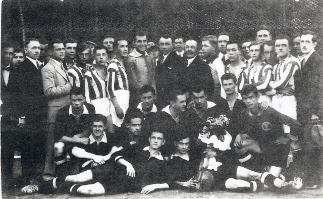 Lata czterdzieste ub. wieku… Na zdjęciu, p. Emil Reguła w drużynie oldbojów BKS-u (w dolnej części, między dwoma bramkarzami)