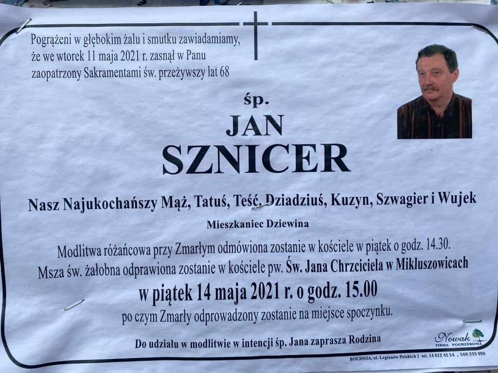 Z olbrzymim smutkiem zawiadamiam, że zmarł Jasiu Sznicer, były piłkarz Bocheńskiego Klubu Sportowego, mój dawny kolega z drużyny. Niewielki wzrostem, za to wielki duchem i umiejętnościami. Świetnie wyszkolony technicznie pomocnik-rozgrywający naszej drużyny. Wszechstronnie uzdolniony sportowiec, dwukrotny mistrz powiatu bocheńskiego w tenisie stołowym. Bochnianin, mieszkaniec Dziewina. Spoczywaj w pokoju, drogi kolego… (jzawada)