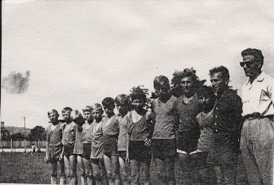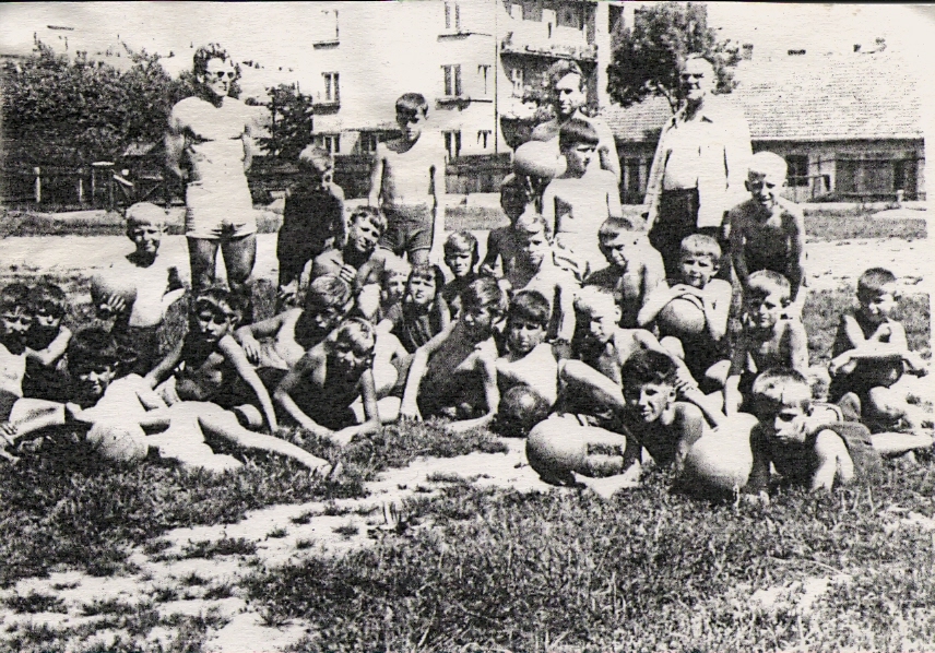 Prehistoria: Półkolonia trampkarska – początek lat 60-tych. Przyszłe (i niedoszłe) gwiazdy BKS-u uczą się pływać w Rabie pod okiem trenera Mariana Biernata – m.in. z prawej, koło trenera najładniejszy 😉 chłopak w grupie Marian Kurek, dalej podparty pod brodę Andrzej Hojnik, z lewej z tyłu,wyróżniający się 🙂 (ale tylko wzrostem!) Józek Zawada.