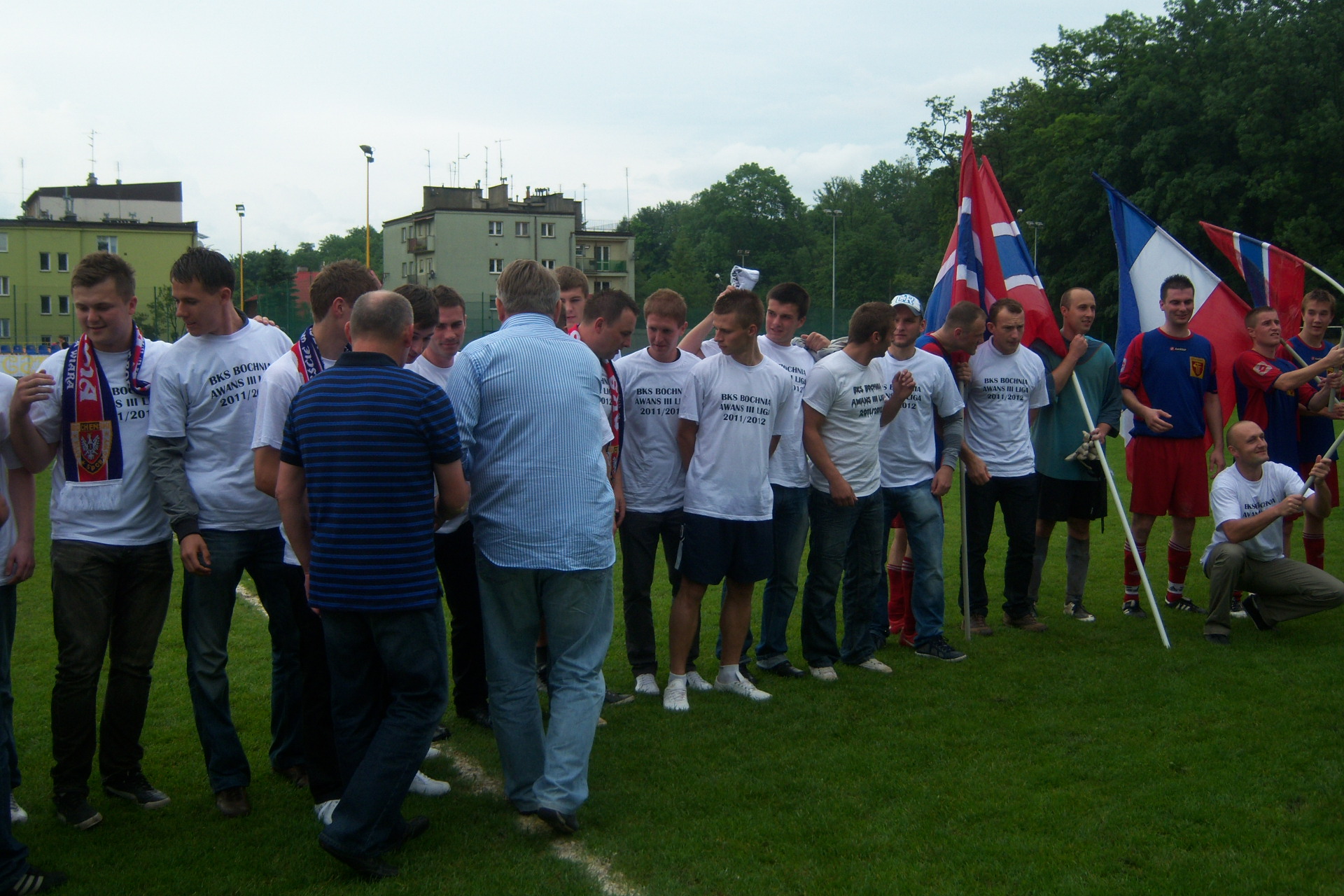 Andrzej Iwan i Marek Motyka gratulują awansu do trzeciej ligi piłkarzom BKS-u