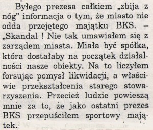 Nie rozumiem, jak można powoływać się na powyższe paragrafy działając odwrotnie do ich znaczenia. I że to wszystko było „zaklepywane” bez skrupułów i w poczuciu całkowitej bezkarności. Bez względu na to, że hojni pseudo-likwidatorzy nie mieli żadnych uprawnień do zmiany ustaleń zawartych w uchwale walnego zebrania członków i tym samym poświadczyli nieprawdę! Jako byłemu wychowankowi BKS-u i wieloletniemu działaczowi tego Klubu wprost w głowie się nie mieści jak można było w pełni świadomie zgodzić się na taką manipulację!? Inna sprawa, że przez całe lata nikogo z klubowych działaczy to nie obchodziło. Nawet wtedy, gdy w październiku 2011 roku napisałem o tej sprawie w artykule (BKS – czy kogoś to jeszcze obchodzi?), a potem przez ponad pięć lat, aż do końca upływającej w 2016 roku prawnej karencji dla tej likwidacji nagłaśniałem tę historię i bezskutecznie próbowałem kogokolwiek nią zainteresować, nie będąc już czynnym działaczem Klubu. Jedyną osobą, na której pomoc mogłem liczyć był radny miejski p. Janusz Balicki, który wystąpił z interpelacją do burmistrza i przekazał mi otrzymane od niego kserokopie dokumentów dotyczące opisywanej przeze mnie sprawy. Jednego odpisu tam tylko nie było, tego najważniejszego, czyli Uchwały Nadzwyczajnego Walnego Zebrania Członków BKS z 13.12.1995 r.! Była za to ciekawa adnotacja burmistrza, którą zacytuję: