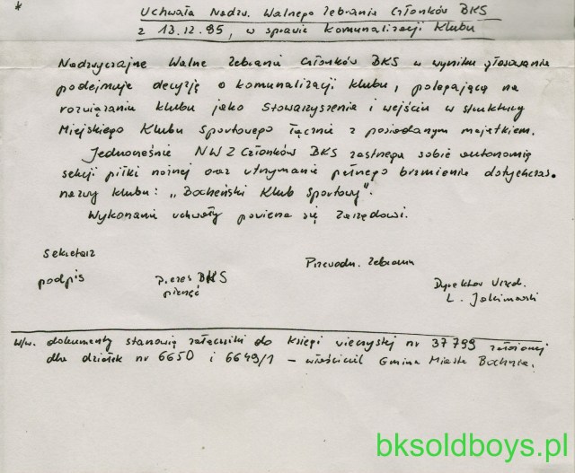 –„Informuję również, że w sprawie udostępnienia powoływanej w w/w dokumentach uchwały Nadzwyczajnego Walnego Zebrania Członków Bocheńskiego Klubu Sportowego z dnia 13.12.1995 roku, dotyczącej komunalizacji Klubu, polegającej na rozwiązaniu Klubu jako stowarzyszenia i wejściu wraz z posiadanym majątkiem w struktury Miejskiego Klubu Sportowego należy wystąpić do Bocheńskiego Klubu Sportowego, gdyż Urząd nie dysponuje tym dokumentem…”