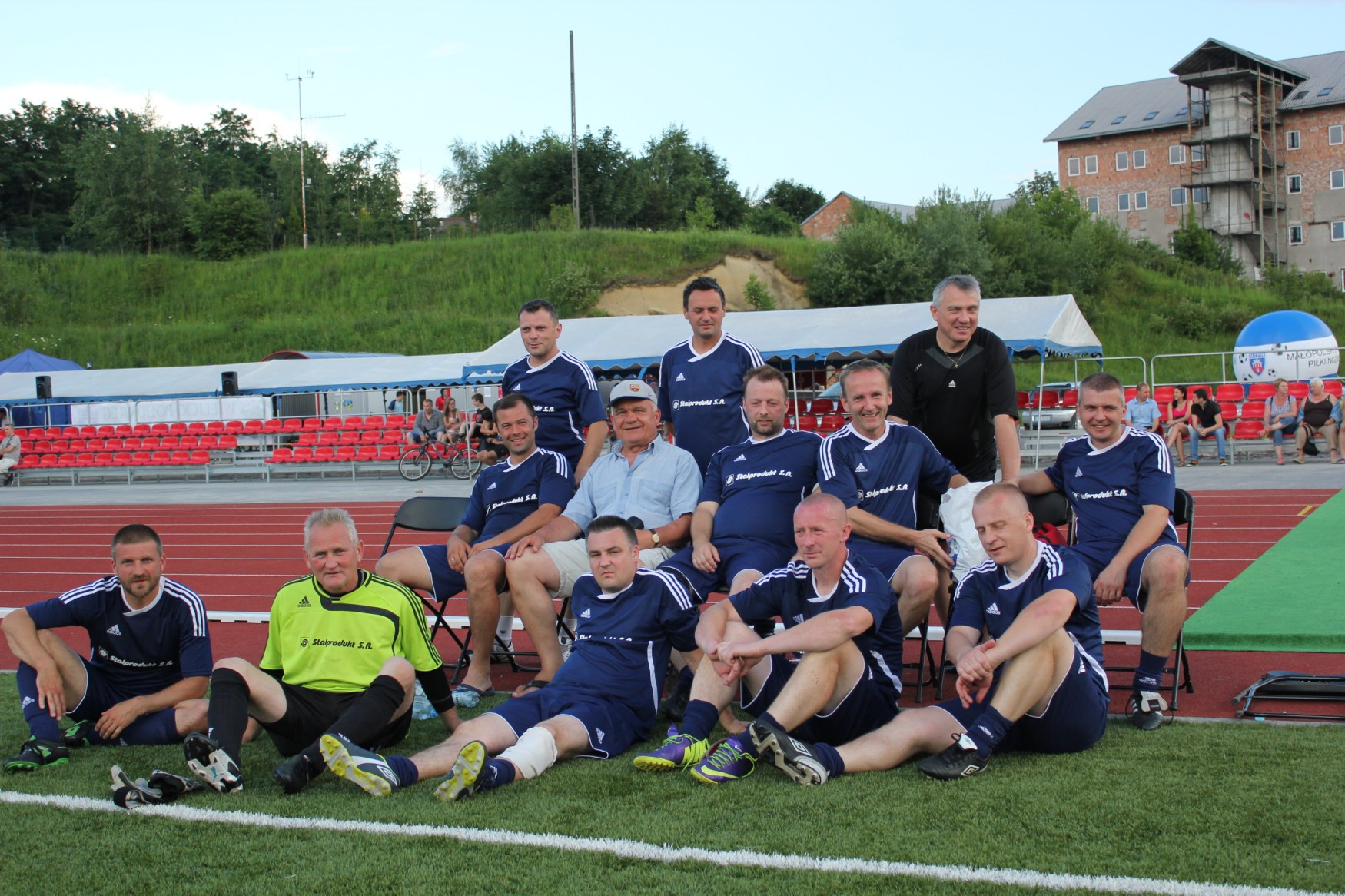 Wrażenia wizualne niezapomniane – ok. 1/3 murawy zajęta przez sporą grupę osób z psami, które szkolą się pod komendą jakiejś pani. Czworonogi wyraźnie podenerwowane przelatującą co jakiś czas piłką. Trochę dalej, podobną część boiska zajmuje kilkanaście betonowych podstaw parasoli (pozostałość po niedzielnej imprezie organizowanej przez MOSiR). Na środku boiska (sic!) stoi duży samochód dostawczy, do którego zbierane są te betony. Obok, na zielonej murawie, czerni się duża plama po wylanym na ziemię oleju ze smażonych frytek oraz innych imprezowych „smakołyków”. No i wreszcie, na pozostałym skrawku trawy ćwiczy grupa ok. dwudziestu piłkarzy, przygotowujących się do III-ligowego sezonu. Jak widać, warunki do treningu wprost wymarzone – pełny komfort!