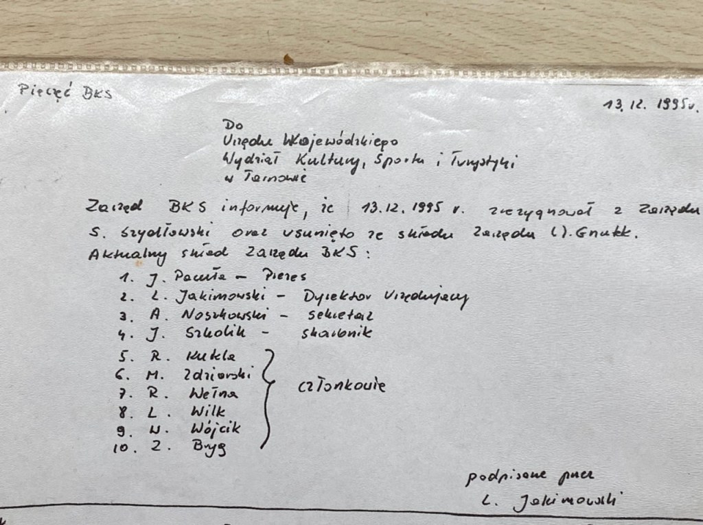 Odręczny odpis dokumentu, którego oryginał znajduje się w archiwum bocheńskiego Sądu Rejonowego. Widnieje na nim skład osobowy ówczesnego Zarządu Klubu wraz z adnotacją o „rezygnacji” z odpowiedzialności przez jednego z członków zarządu… Powyższego odpisu dokonała uprawniona osoba z Urzędu Miasta.